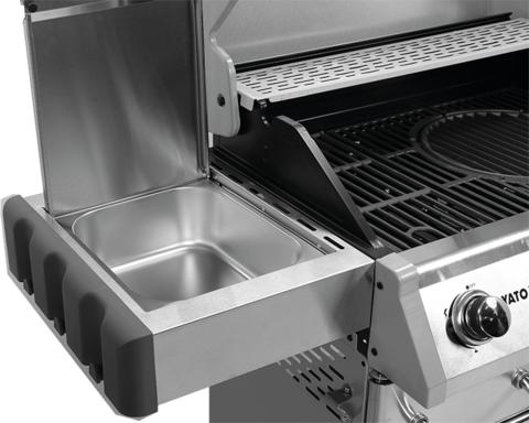 Grill gazowy 6+1 o nowoczesnym wyglądzie wykonany ze stali nierdzewnej, wyposażony w żeliwny ruszt o wymiarach 82 x 41,5 cm. Półki boczne oraz pojemna, zamykana szafka ułatwią przechowywanie przypraw i niezbędnych akcesoriów. Palnik boczny o mocy 2,2 kW umożliwi gotowanie i podgrzewanie potraw w garnku lub na patelni. Dodatkowym atutem jest miejsce na butlę gazową, pojemnik ze stali nierdzewnej umieszczony w jednej z półek bocznych oraz wbudowany otwieracz do butelek.