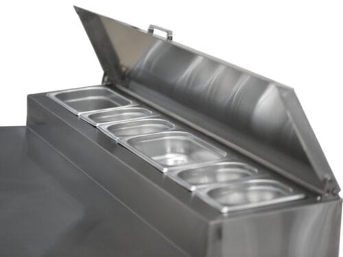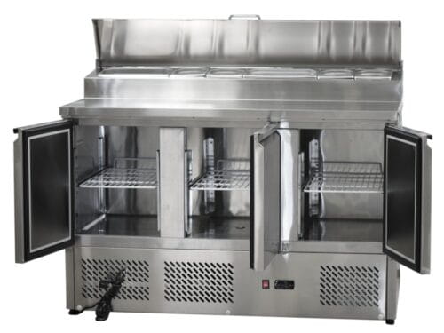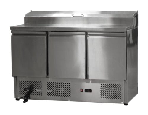 3-drzwiowy stół chłodniczy ESL z agregatem na dole wykonany ze stali nierdzewnej przystosowany do pojemników gastronomicznych GN1/1. Nadstawka przystosowana do 8 pojemników GN 1/6