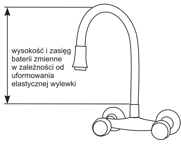 Bateria zlewozmywakowa ścienna, z pokrętłami. Wylewka elastyczna w różnych kolorach – pomarańczowym, zielonym, czarnym, niebieskim i czerwonym. Wysokość baterii zmienna w zależności od ukształtowania wylewki. Całkowita długość elastycznej wylewki 530 mm. Głowice baterii suwakowe. Przyłącza standardowe mimośrody, rozstaw króćców przyłączeniowych – 150 mm.