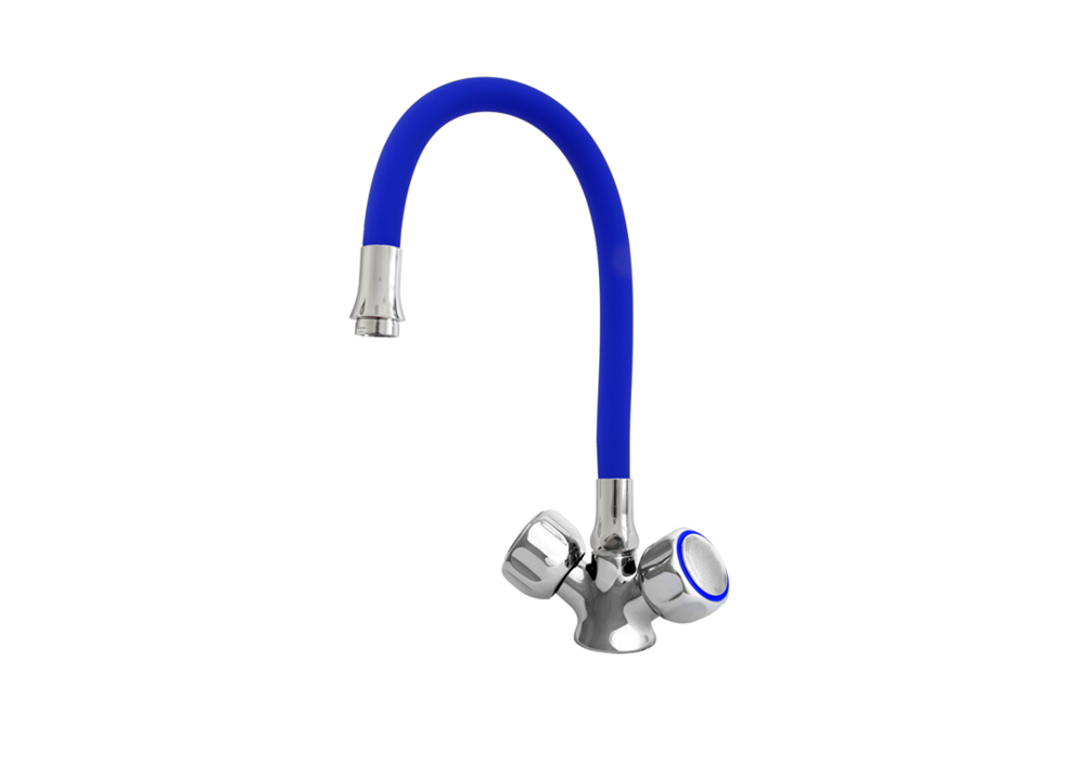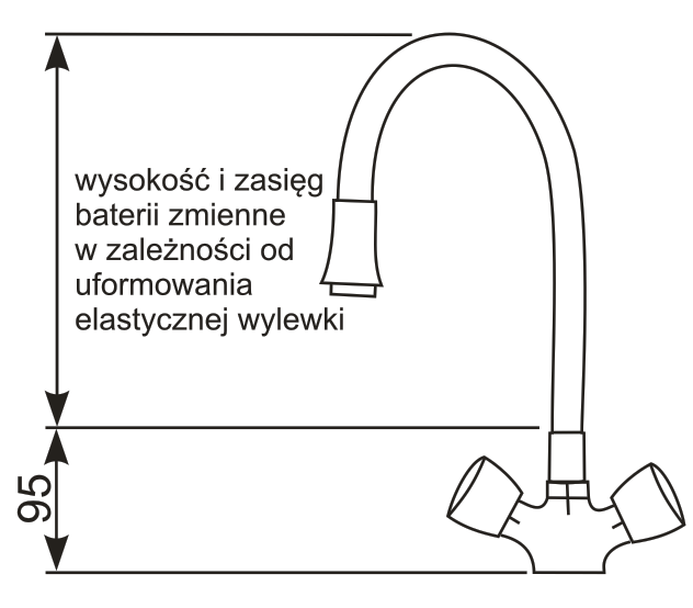 Bateria zlewozmywakowa stojąca, jednootworowa, z pokrętłami. Wylewka elastyczna w różnych kolorach – pomarańczowym, zielonym, czarnym, niebieskim i czerwonym. Wysokość baterii zmienna w zależności od ukształtowania wylewki. Całkowita długość elastycznej wylewki 530 mm. Głowice baterii suwakowe. W komplecie dwa elastyczne wężyki przyłączeniowe w oplocie stalowym z końcówką 3/8″.