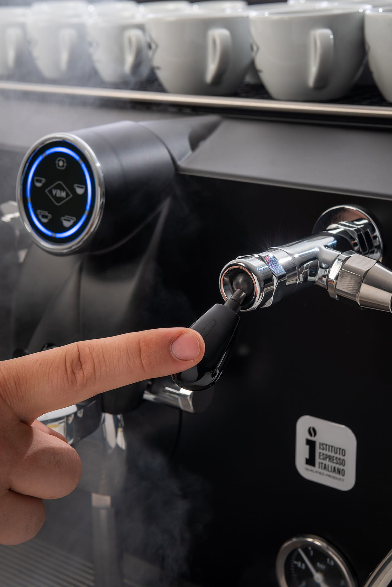 - Sterowane dyszą spieniania mleka oraz wylewką wody za pomocą ergonomicznych dźwigni, które zapewniają szybką obsługę ekspresu
