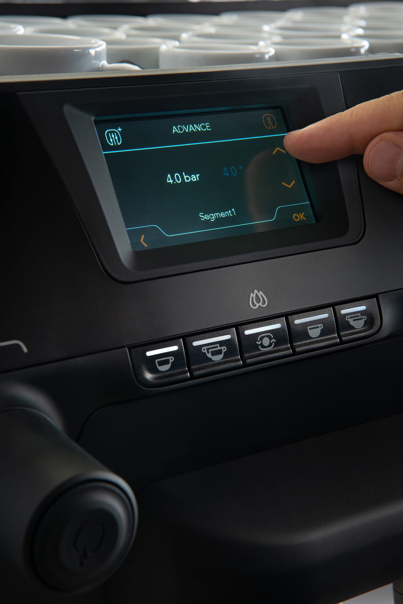 - Każda grupa wyposażona w wyświetlacz dotykowy 4,3’’ do zarządzania wszystkimi ustawieniami urządzenia i alertami, np. temperaturą zaparzania kawy, temperaturą zaparzania herbaty, ciśnieniem w bojlerze, w komorze zaparzającej, funkcją PID, podgrzewaczem filiżanek ect.
