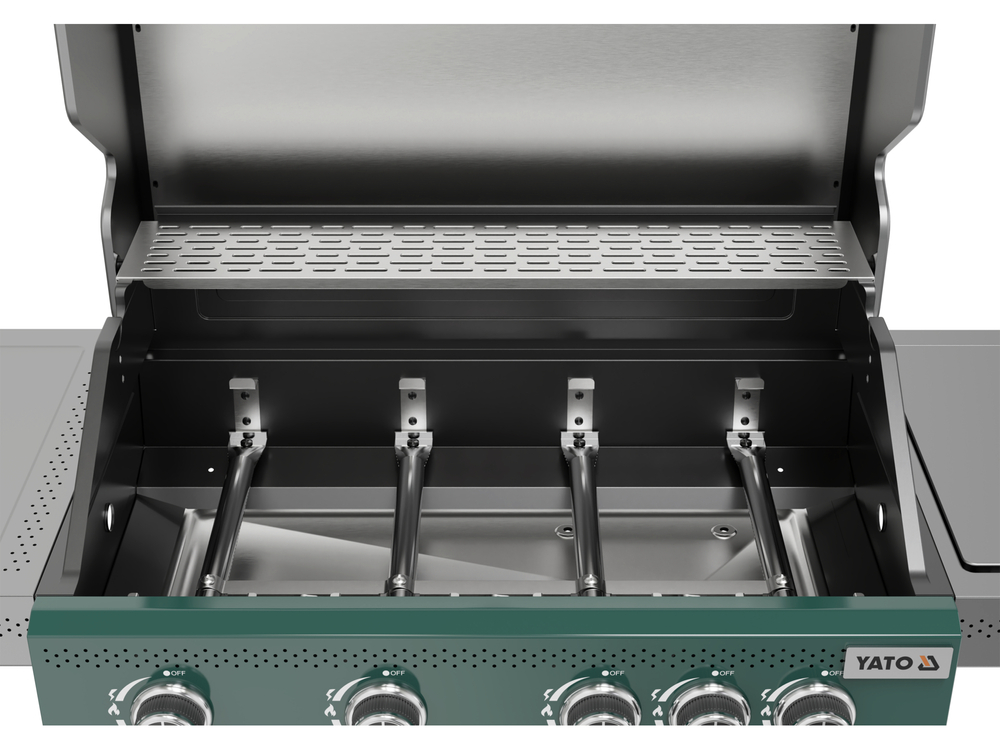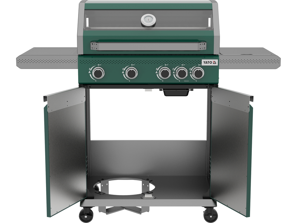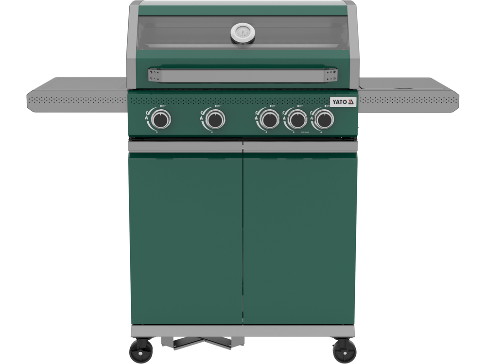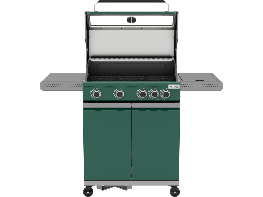 Nowoczesny grill gazowy 4 + 1 z serii YATO Itami w kolorze zielono-szarym. kontrolery w, żeliwny ruszt o powierzchni 68 x 42 cm oraz kratka podgrzewająca ze stali nierdzewnej. Łączna moc palników wynosi 14,2 kW. Półki boczne oraz pojemna, zamykana szafka umożliwia dostarczanie dodatków i akcesoriów.