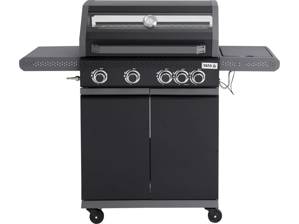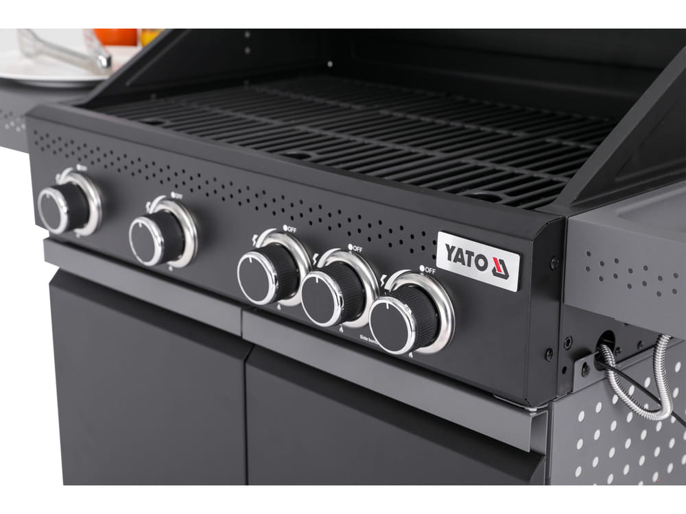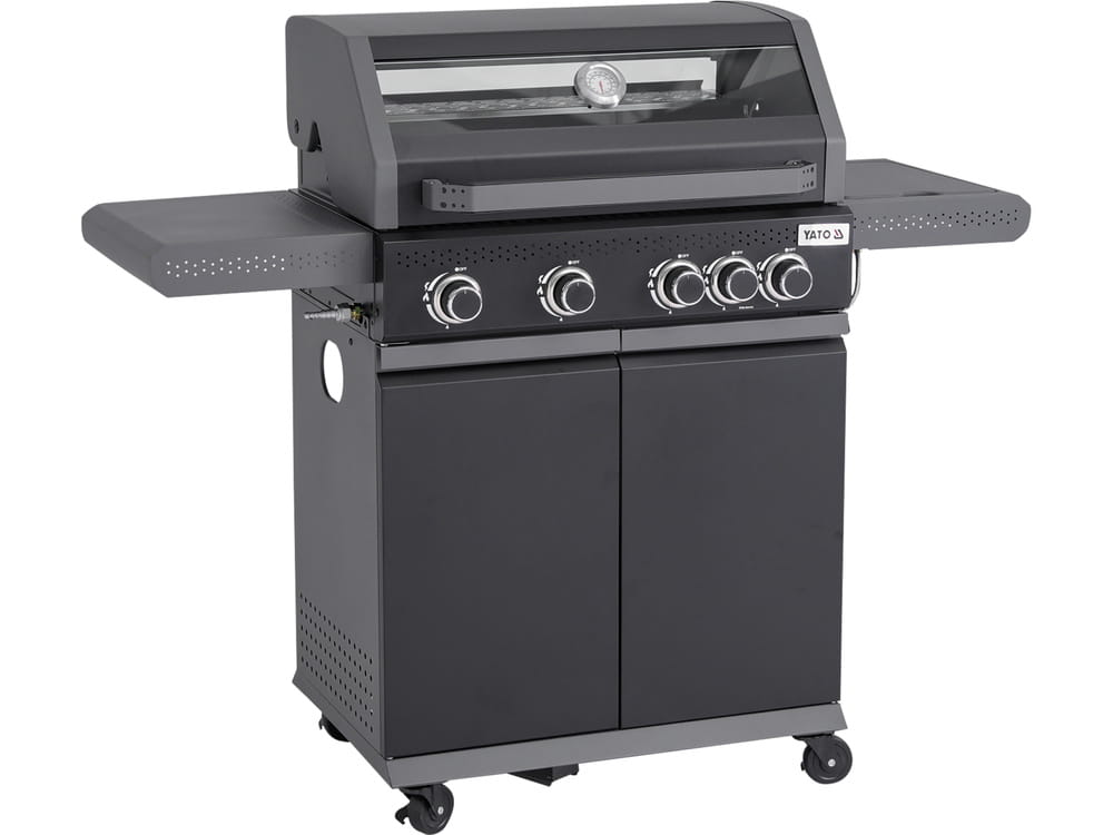 Unikalny, nowocześnie wyglądający grill gazowy YATO Okaya 4+1 i łącznej mocy 14,2kW. Wyposażony w niezawodny, żeliwny ruszt o powierzchni 68 x 42 cm oraz kratkę podgrzewającą ze stali nierdzewnej.