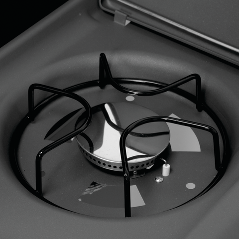 Palnik boczny o mocy 2,2 kW umożliwi gotowanie i podgrzewanie potraw w garnku lub na patelni. Dodatkowym atutem jest miejsce na butlę gazową oraz szyba w pokrywie.