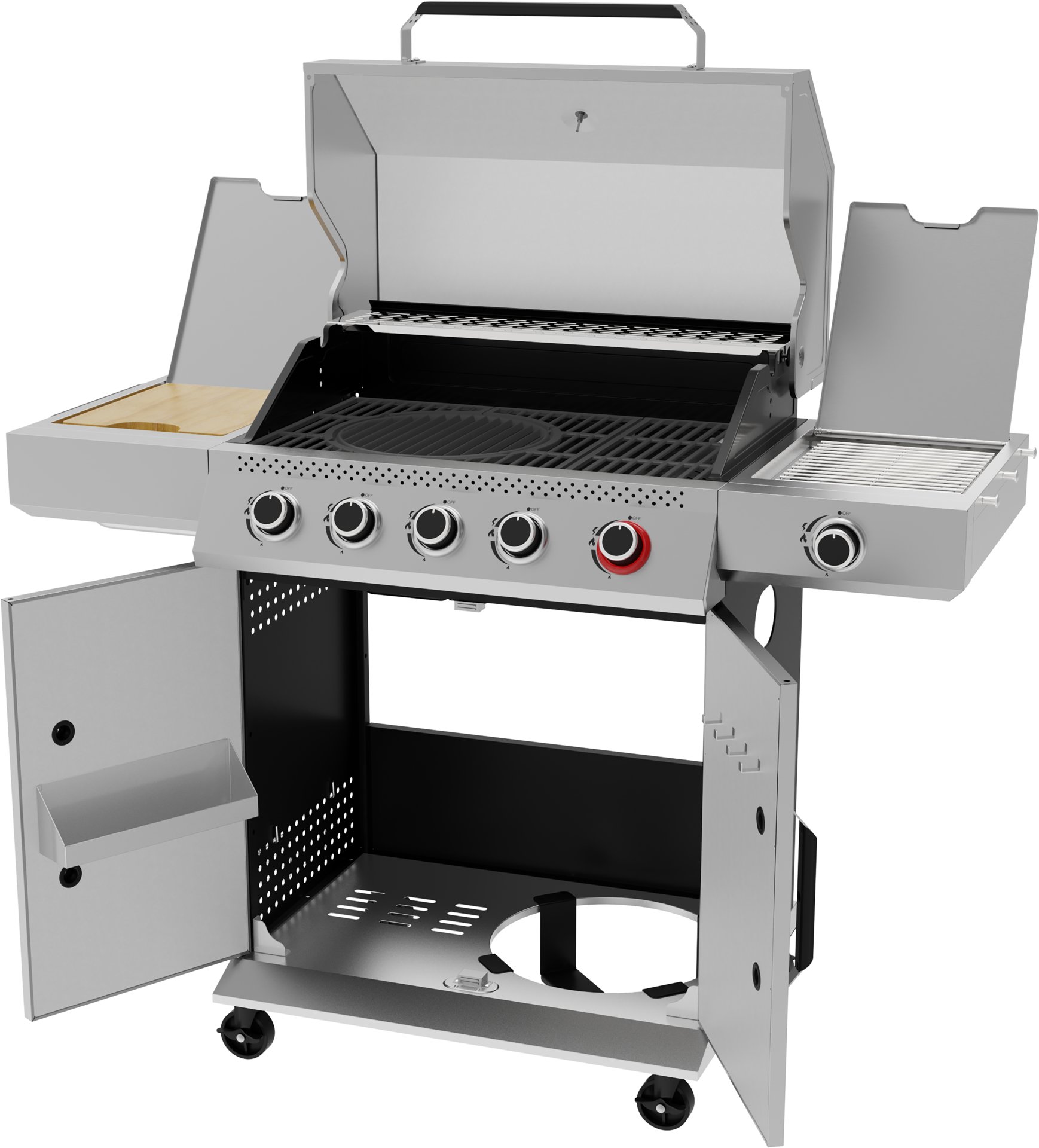 - 4 odchylane drzwi z hamulcami, które umożliwiają odblokowanie grilla i uruchomienie go na każdym rodzaju podłoża