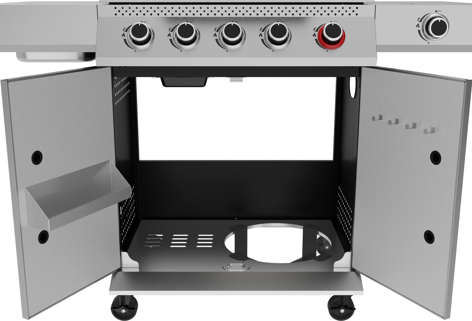 - Palnik boczny na podczerwień o mocy 3,5 kW osiąga ekstremalnie wysoką temperaturę 800 stopni, umożliwia szybkie obsmażenie (tzw.sear) i przyrządzanie steków (nie zaleca się stosowania jako palnika podgrzewającego garnki, patelnie itd.)