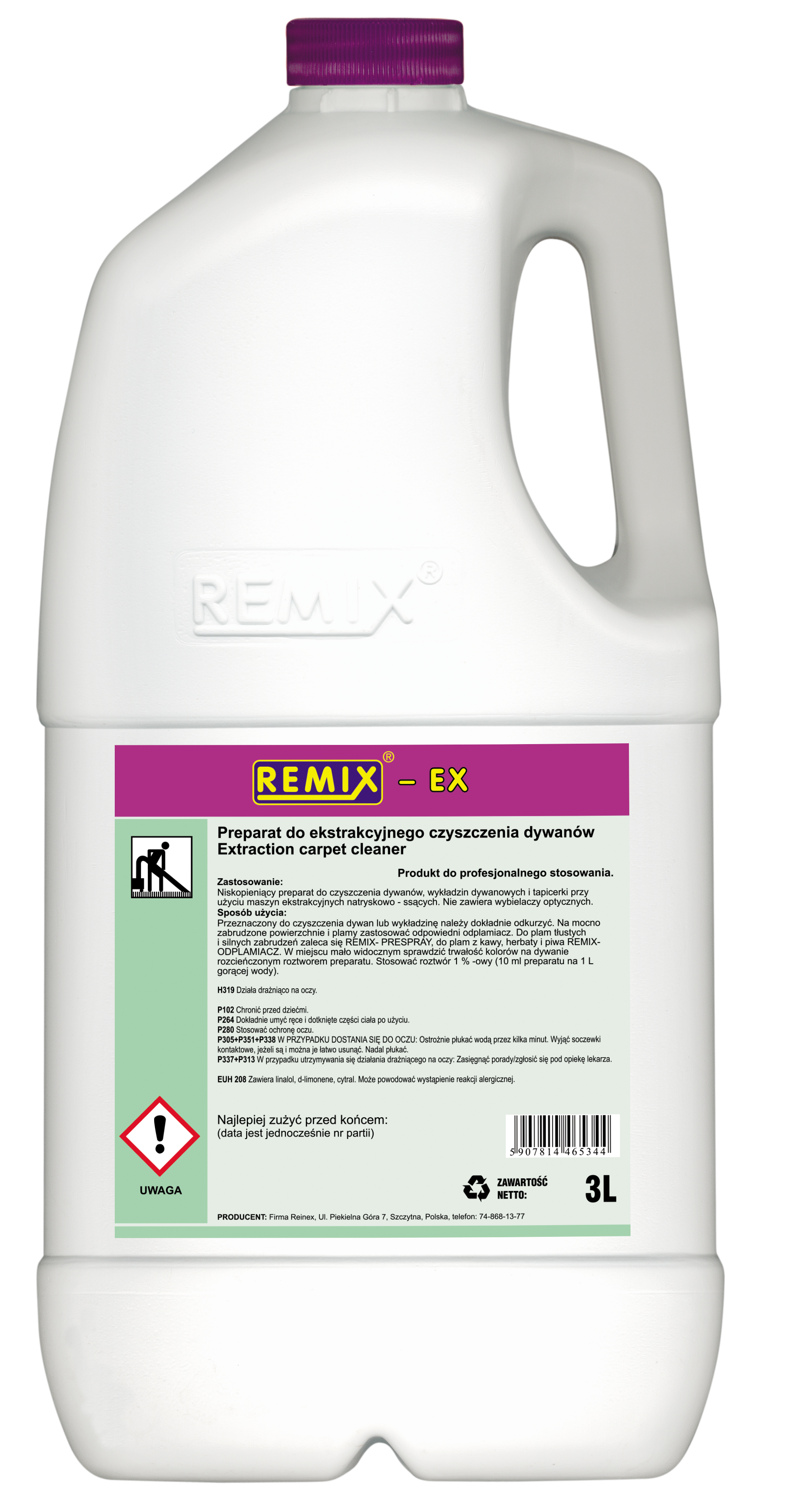 Przed czyszczeniem ekstrakcyjnym zaleca się usunąć mocniejsze zabrudzenia przy pomocy preparatu REMIX PRESPRAY. Do czyszczenia ekstrakcyjnego stosować 1%-owy roztwór REMIX - EX (10 ml preparatu na 1 litr gorącej wody), następnie zaczesać wykładzinę w jednym kierunku i pozostawić do całkowitego wyschnięcia.
