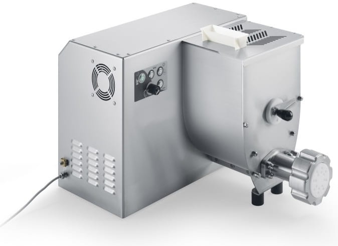 - Model Ciao Pasta 10 posiada opcję chłodzenia wodą głowicy, co jest wskazane przy intensywnym użytkowaniu. Jeden z wężyków doprowadza zimną wodę do głowicy, drugi ją odprowadza. Dodatkowy zestaw do recyrkulacji wody pozwala na jej odzyskanie i ponowne wykorzystanie w chłodzeniu głowicy, tworząc obieg zamknięty.