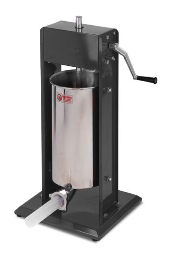 Profesjonalna pionowa nadziewarka stołowa do kiełbas CV-5 o poj. 5 litrów posiadająca nierdzewny pojemnik na farsz oraz lakierowaną na szaro obudowę. Nadziewarka wyposażona jest w mechanizm przekładniowy. Posiada odpowietrzenie w tłoku.