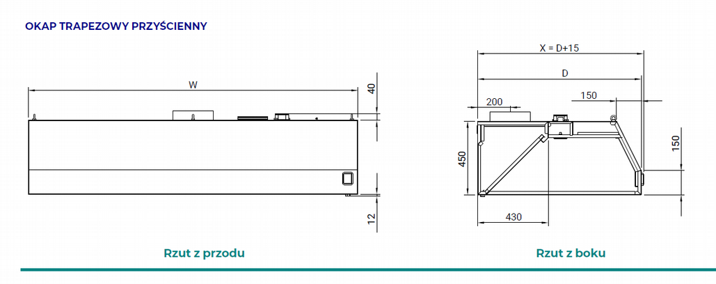 Okap przyścienny trapezowy wym. 1200x800x450 mm Stalgast model 207, wyciągowy, bez łapaczy, bez oświetlenia