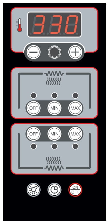 - Precyzyjna kontrola ciepła poprzez elektroniczną regulację temperatury, oraz oddzielne, niezależne sterowanie górnymi i dolnymi grzałkami