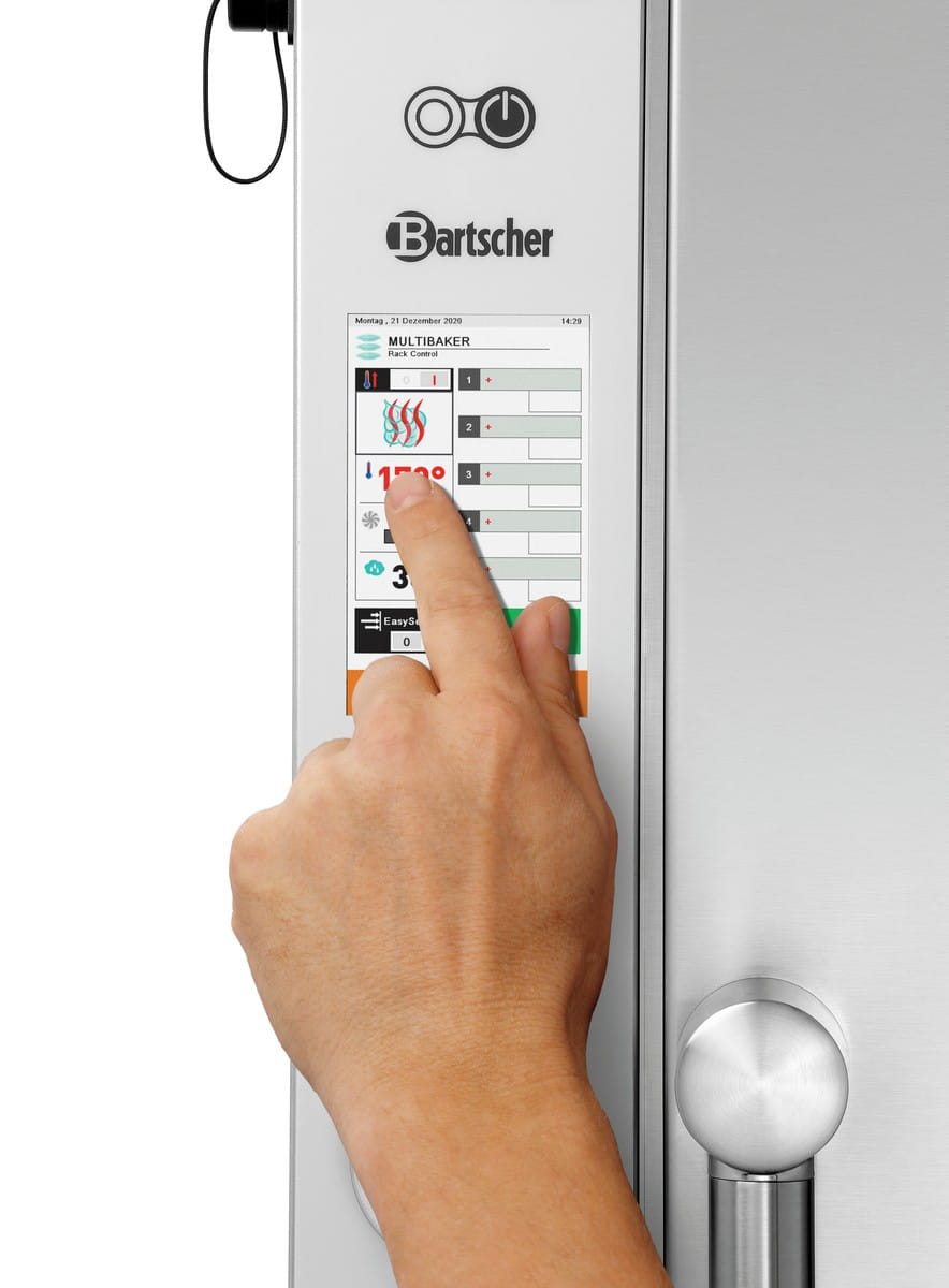 Piec konwekcyjno-parowy marki Bartscher z serii Silversteam z elektroniczną obsługą, systemem czyszczenia i 7 parami prowadnic w formacie 1/1 GN – idealny partner w każdej kuchni. Dzięki funkcji Rack Control możliwe jest przygotowanie najróżniejszych potraw w różnym czasie. Jest to ułatwienie, dzięki któremu model Silversteam ma wszystko pod kontrolą.