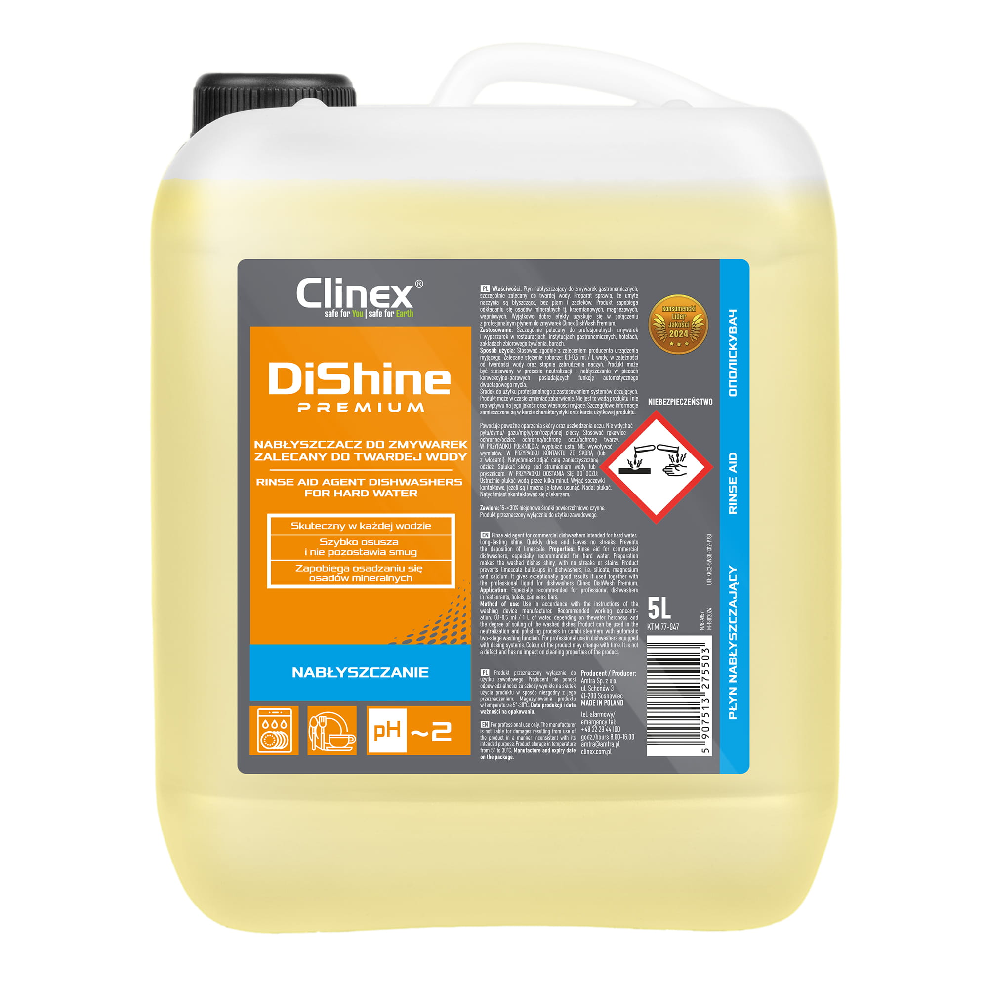 Clinex DiShine Premium to płyn nabłyszczający do zmywarek gastronomicznych, szczególnie zalecany do twardej wody. Preparat sprawia, że umyte naczynia są błyszczące, bez plam i zacieków. Produkt zapobiega odkładaniu się osadów mineralnych tj. krzemianowych, magnezowych, wapniowych. Wyjątkowo dobre efekty uzyskuje się w połączeniu z profesjonalnym płynem do zmywarek Clinex DishWash Premium.
