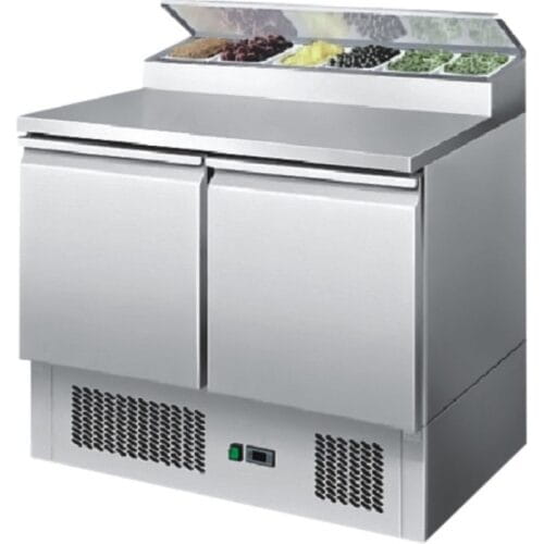 2-drzwiowy stół chłodniczy ESL z agregatem na dole wykonany ze stali nierdzewnej przystosowany do pojemników gastronomicznych GN1/1. Urządzenie doskonale nadaje się do różnego rodzaju punktów gastronomicznych tj. restauracje, pizzerie, bary, fast-food’y, puby itp.