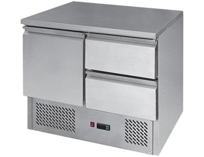 Gastronomiczny stół chłodniczy ESL z szafką i blokiem 2 szuflad wykonany ze stali nierdzewnej. Urządzenie posiada agregat chłodniczy umieszczony na spodzie. Doskonale nadaje się do różnego rodzaju punktów gastronomicznych tj. restauracje, pizzerie, bary, fast-food’y, puby itp.