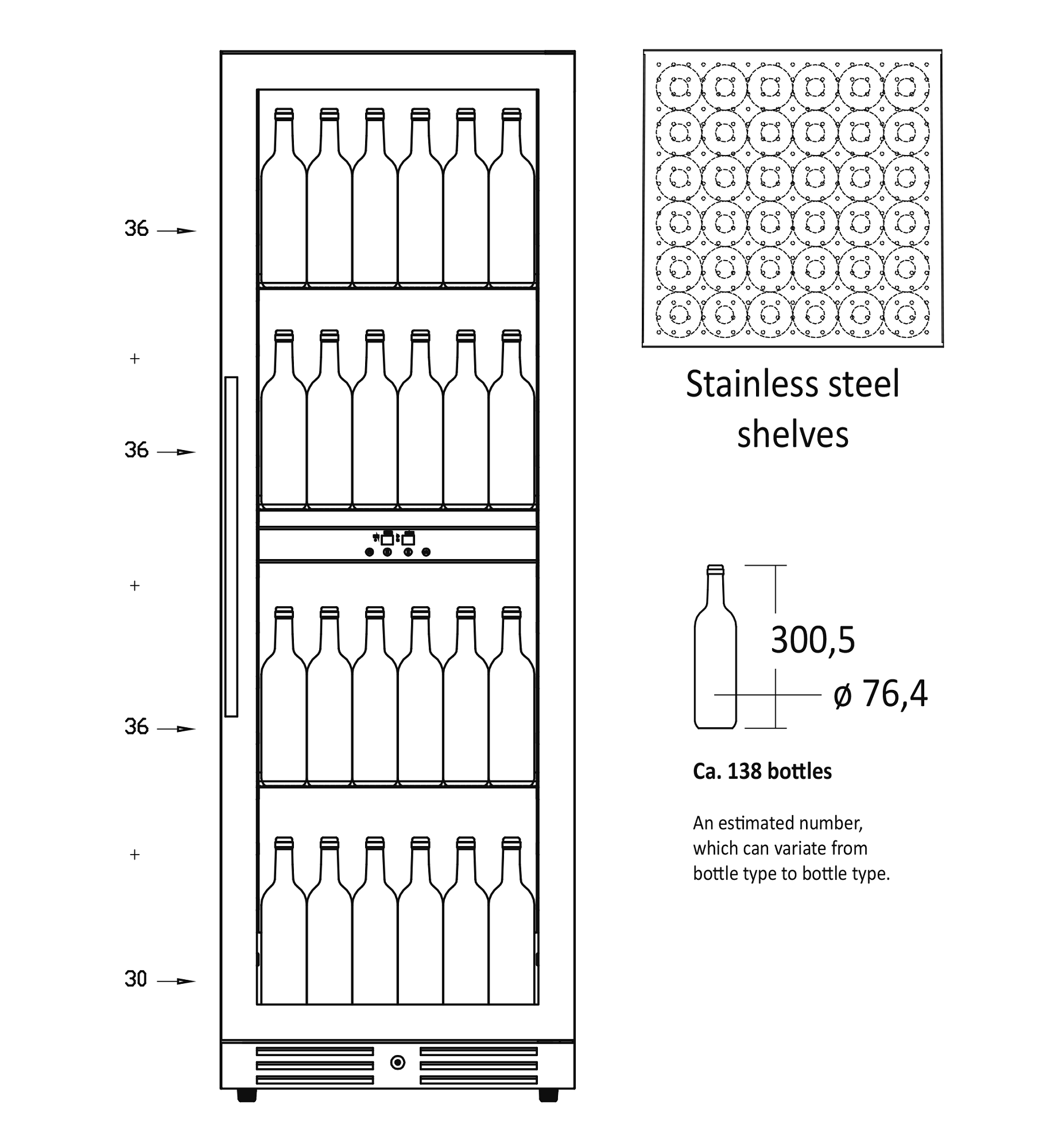 - Winiarka może pomieścić 138 butelek rozmieszczonych na 3 stalowych półkach