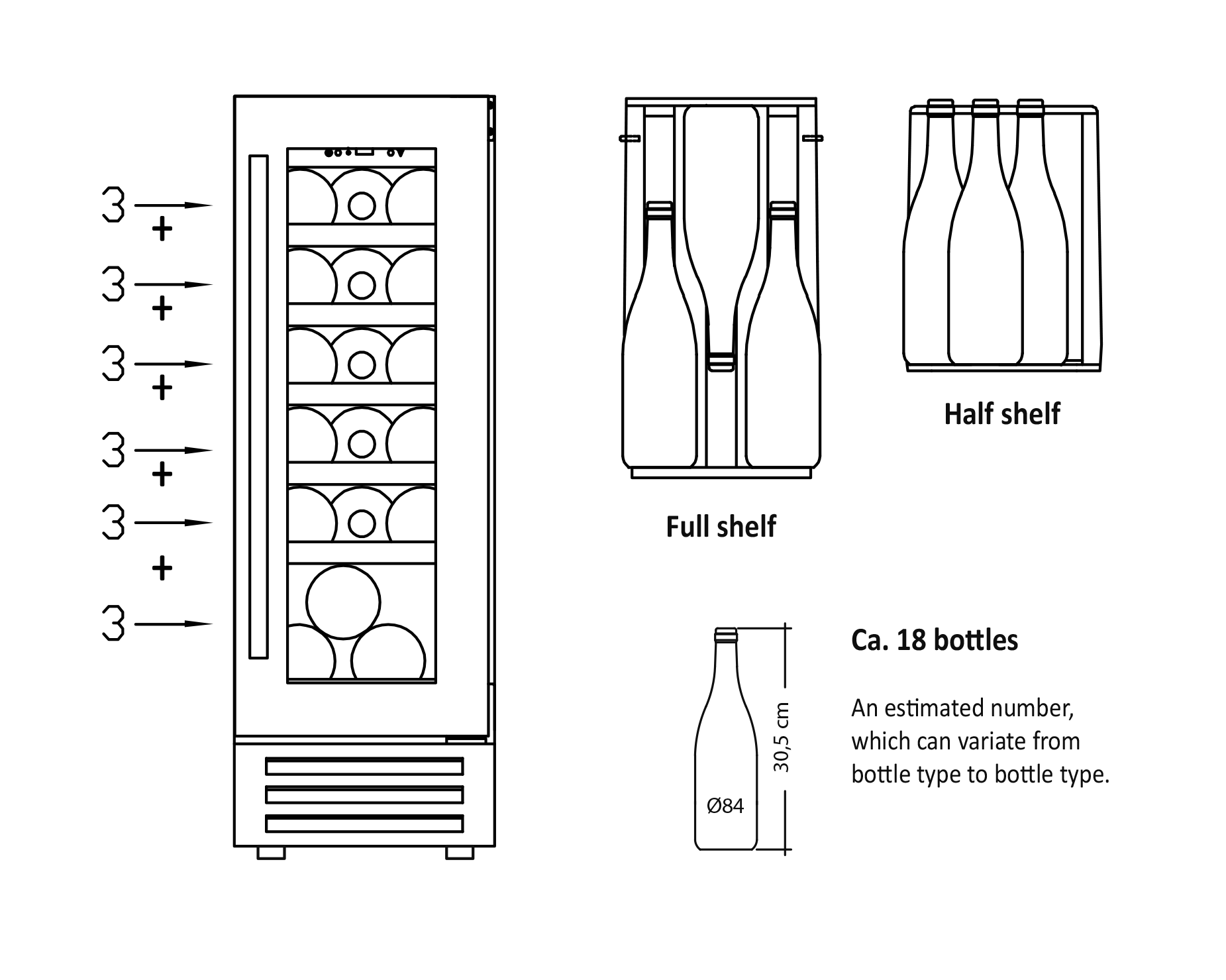 • Winiarka może pomieścić 18 butelek rozmieszczonych na półkach z drewna bukowego