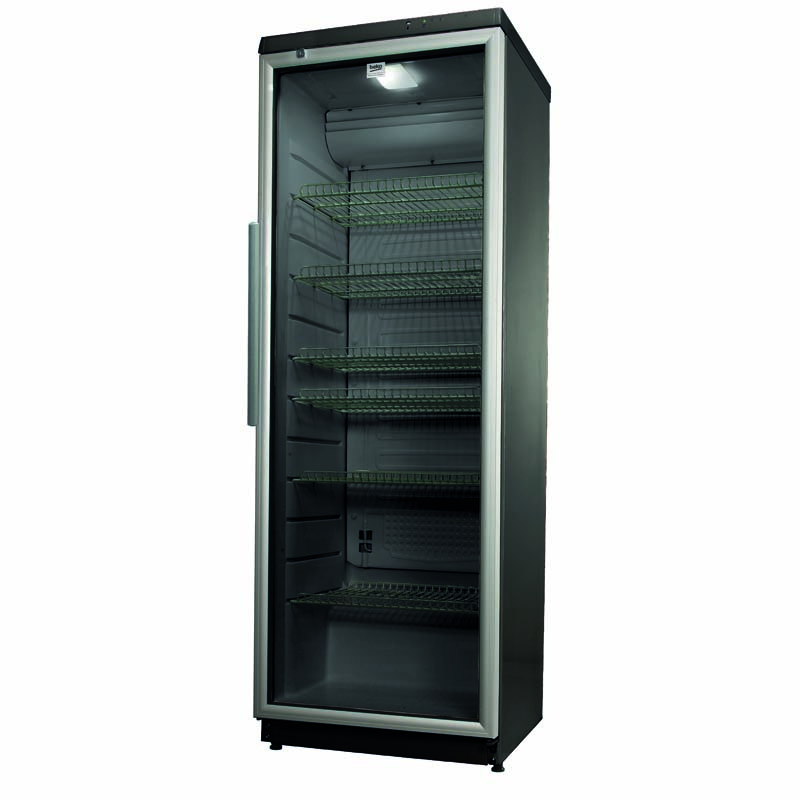 Lodówka z przeszklonymi drzwiami przeznaczona do przechowywania i eksponowania żywności lub napojów. Idealna do barów, pubów i restauracji. Automatyczne rozmrażanie i automatyczne odparowywanie wody. Wentylowana. Ciemnoszara powierzchnia zewnętrzna i wewnętrzna. Maksymalna temperatura otoczenia 32°C. Podwójne szklane drzwi i solidny uchwyt. Zamek w drzwiach. Aluminiowa rama drzwi. Regulowane półki i nóżki. Sterowanie mechaniczne z termometrem. Klasa energetyczna D. Wtyczka Schuko.