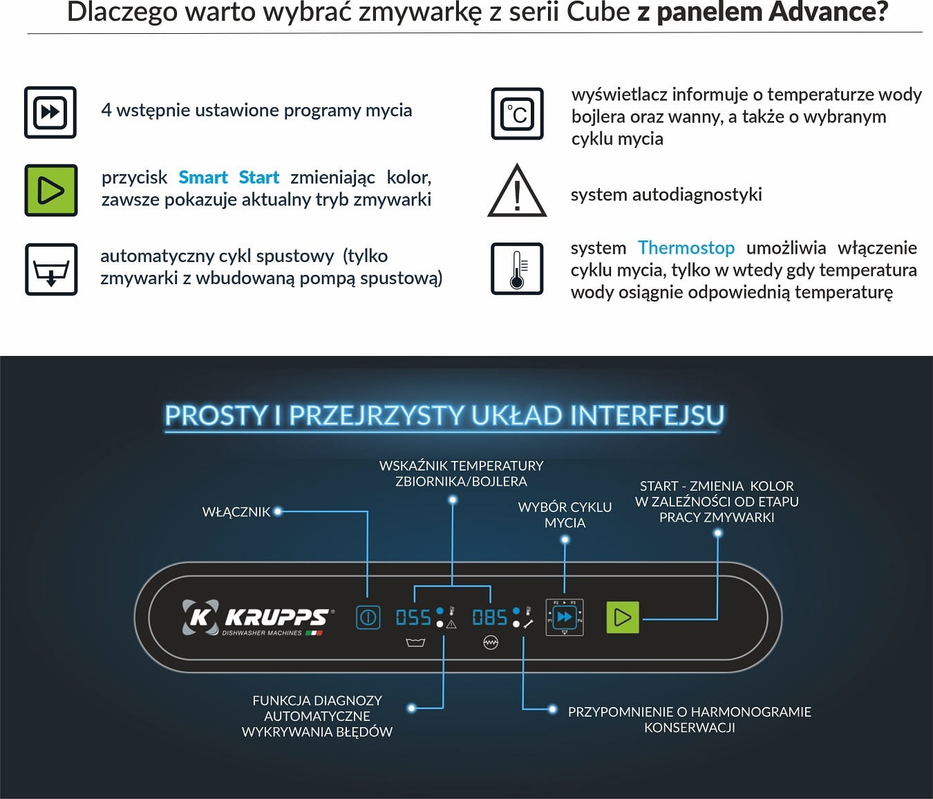 • Elektroniczny panel sterowania ADVANCE jest prawdziwym atutem linii Advance, dzięki 4 cyklom mycia i automatycznemu spustowi wody (w modelach z zainstalowaną pompą spustową)