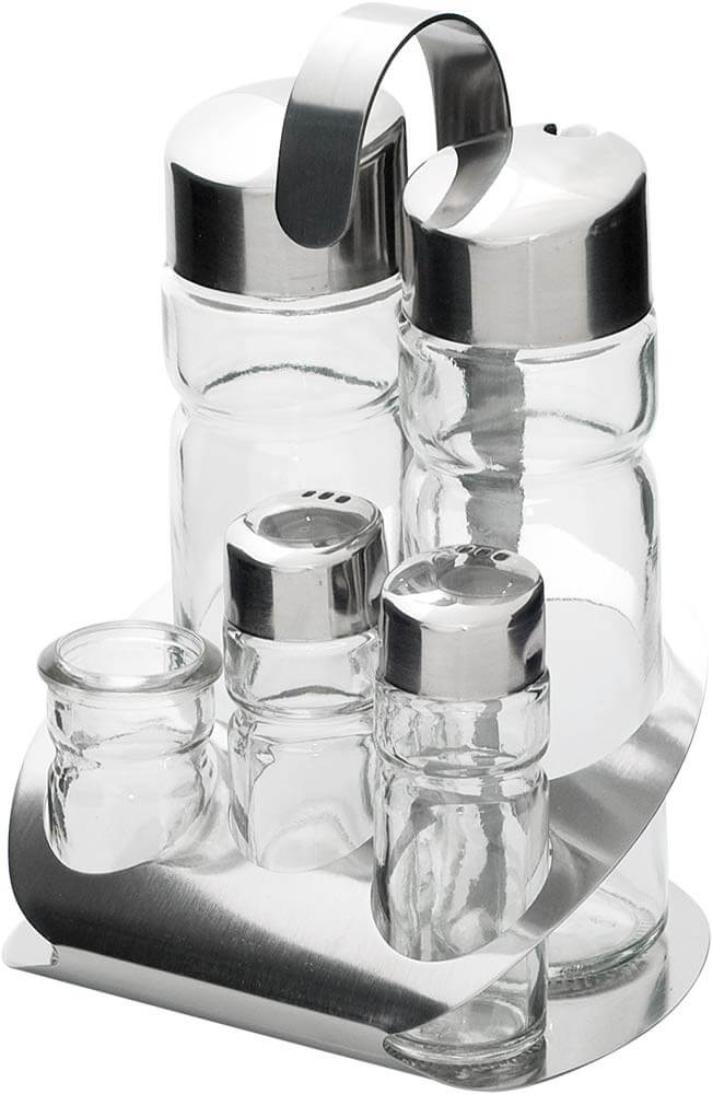 - pojemniki na przyprawy, solniczka, pieprzniczka, pojemnik na wykałaczki, 2 pojemniki na przyprawy płynne